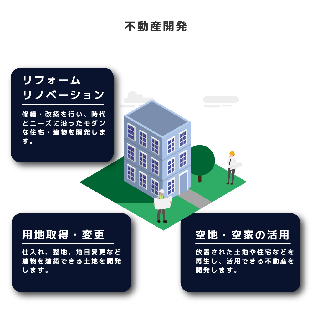不動産開発業では、地域のニーズと未来を見据えた開発プロジェクトを手掛けています。私たちは、環境に配慮した持続可能な開発を目指し、土地の特性を活かした創造的なプランを提案します。市場動向を見極め、収益性と地域貢献の両立を図る開発を推進し、次世代に誇れる街づくりに取り組んでいます。