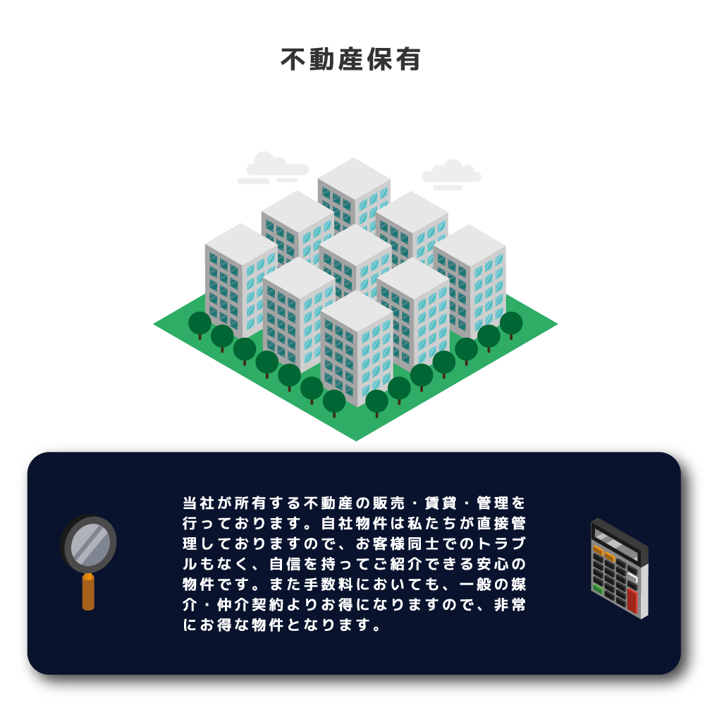 不動産保有事業では、長期的な視点で資産の保有と運用を行います。保有する不動産の価値を最大化するため、継続的な管理や運営に取り組み、安定した収益を確保することを目指しています。市場の変動にも柔軟に対応し、お客様の資産を堅実に守りながら成長させるサポートを提供します。